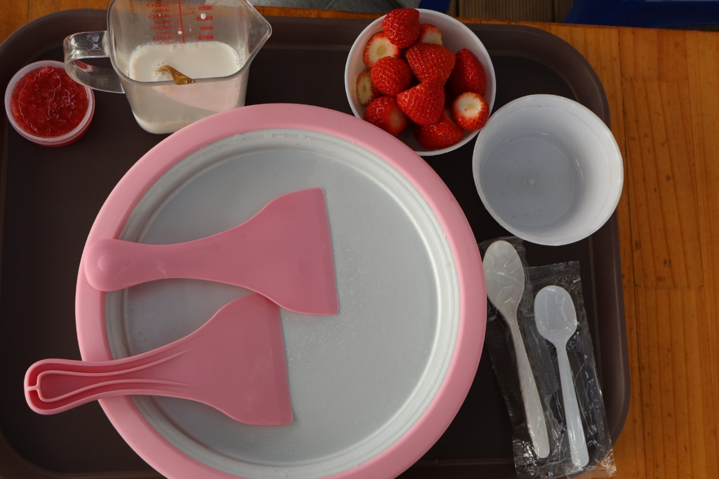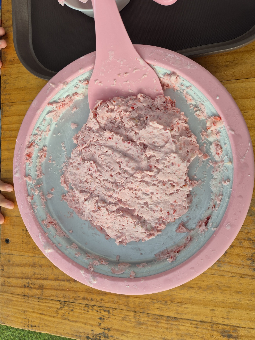 우선 딸기를 아이스크림판에서 잘게 부숴줍니다.